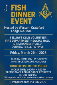 Our fellow Brethren at Western Crawford Lodge No. 258 (Conneautville, PA) will be holding a Fish Fry on Friday March 27, 2026. Please plan to attend and be served the best fish in Northwestern PA.