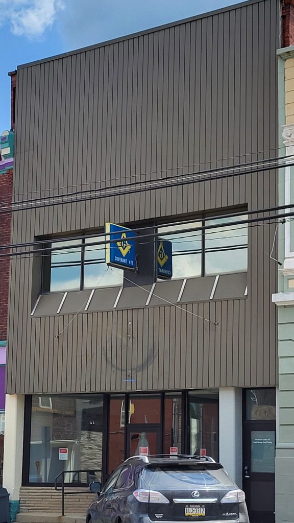 In February 1870, eight members of Oasis Lodge No. 416, in nearby Edinboro, petitioned The Grand Lodge of Pennsylvania for a charter for a Lodge to be located in Cambridgeboro. The charter was granted and on July 19, 1870, Covenant Lodge No. 473 was constituted. The twelve total charter members were all made Master Masons in other Lodges. Eleven of them were from Oasis and one from Grand Rapids Lodge No. 289, Ohio. The total membership for that year was twenty-one. The membership was made up of farmers, blacksmiths, merchants, teachers, druggists, and a Doctor of Medicine. The Lodge was located on the second floor of the Grange Co-operative grocery store owned by J. L. Kelly. This building was located on the northwest corner of Main and McClellan Streets. The rent was $100 per year.